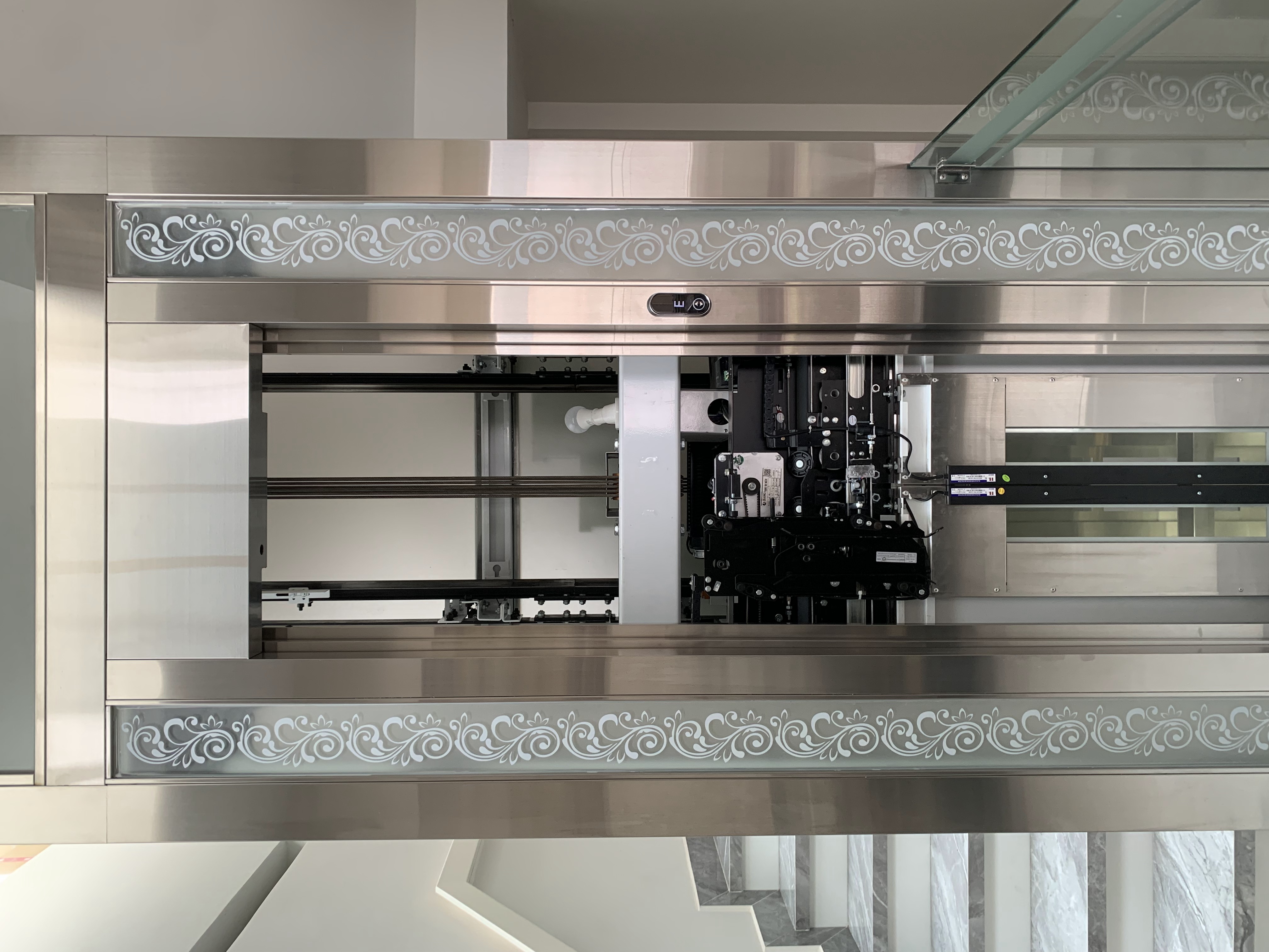 Sự tỉ mỉ thể hiện rõ nét ở việc kết hợp các tấm kính mờ. Thay vì để kính trong suốt phô diễn mọi chi tiết bên trong, kính mờ giúp tán xạ ánh sáng một cách êm dịu, vừa đảm bảo sự riêng tư, vừa giữ cho khối kiến trúc 3 tầng của thang máy trở nên thanh thoát, không bị nặng nề bởi cảm giác kim loại.