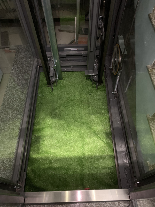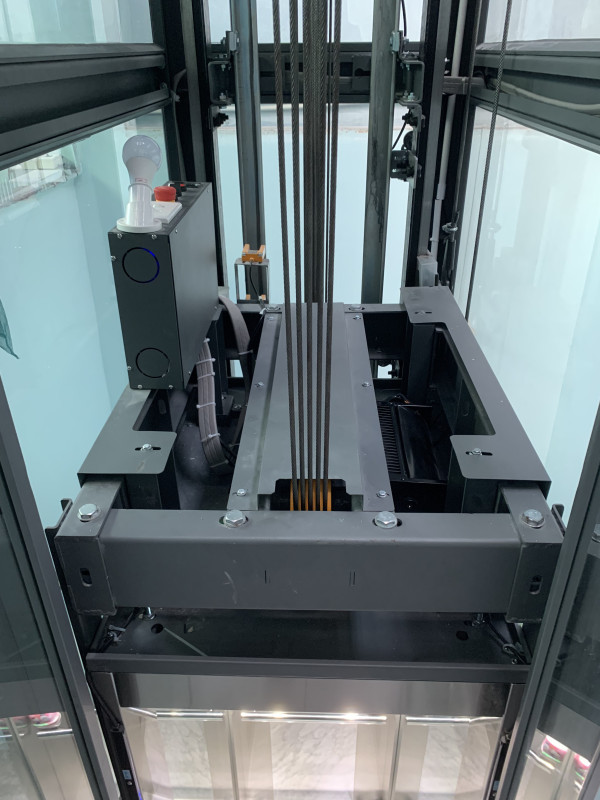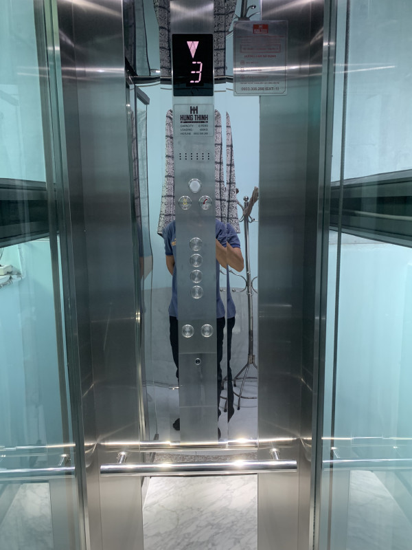 - Khung Thép Tinh Gọn: Khung thang sử dụng thép hộp màu Xám Xifa hiện đại, kết hợp với kính cường lực trong suốt, tạo cảm giác không gian mở, không hề bị bí bách dù kích thước nhỏ. Thang phục vụ 4 tầng hiệu quả.