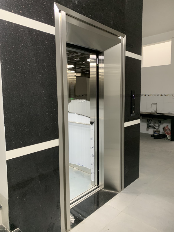 Công trình nhà anh Trung là một ví dụ điển hình cho việc lắp đặt thang máy trong công trình đã hoàn thiện toàn bộ, bao gồm cả phần mặt tiền. Với đặc điểm khung bao rộng và các khoảng hở xung quanh cửa thang không đều nhau, đội ngũ thi công đã lựa chọn giải pháp sử dụng nẹp V để che phủ các khe hở, đảm bảo tính thẩm mỹ và tạo cảm giác liền khối cho toàn bộ hệ khung cửa. Đây là phương án xử lý tinh tế, giúp khung bao trông gọn gàng, sạch sẽ dù được thi công sau.