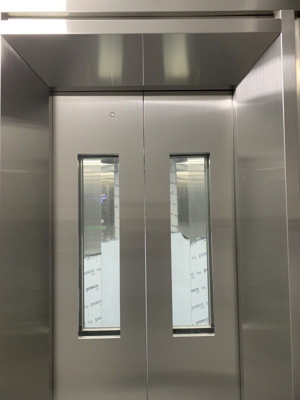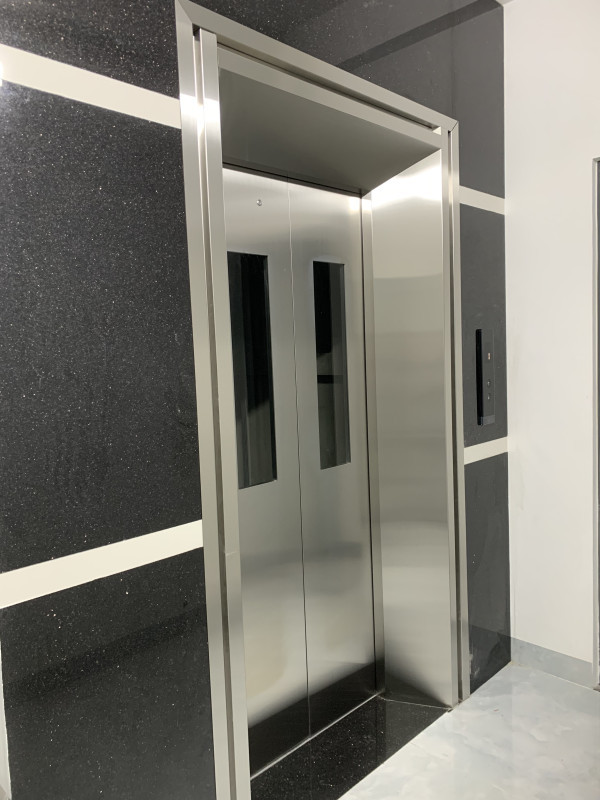 Một điểm đặc biệt khác của công trình này là sử dụng cửa tầng kính – tuy nhiên, kính được thiết kế nhỏ gọn, vừa đủ để quan sát cabin bên trong. Thiết kế này không chỉ tăng thêm tính thẩm mỹ mà còn phục vụ mục đích an toàn: trong trường hợp thang máy gặp lỗi, người sử dụng có thể dễ dàng quan sát vị trí cabin, hỗ trợ hiệu quả cho công tác mở cửa cứu hộ khi cần thiết.