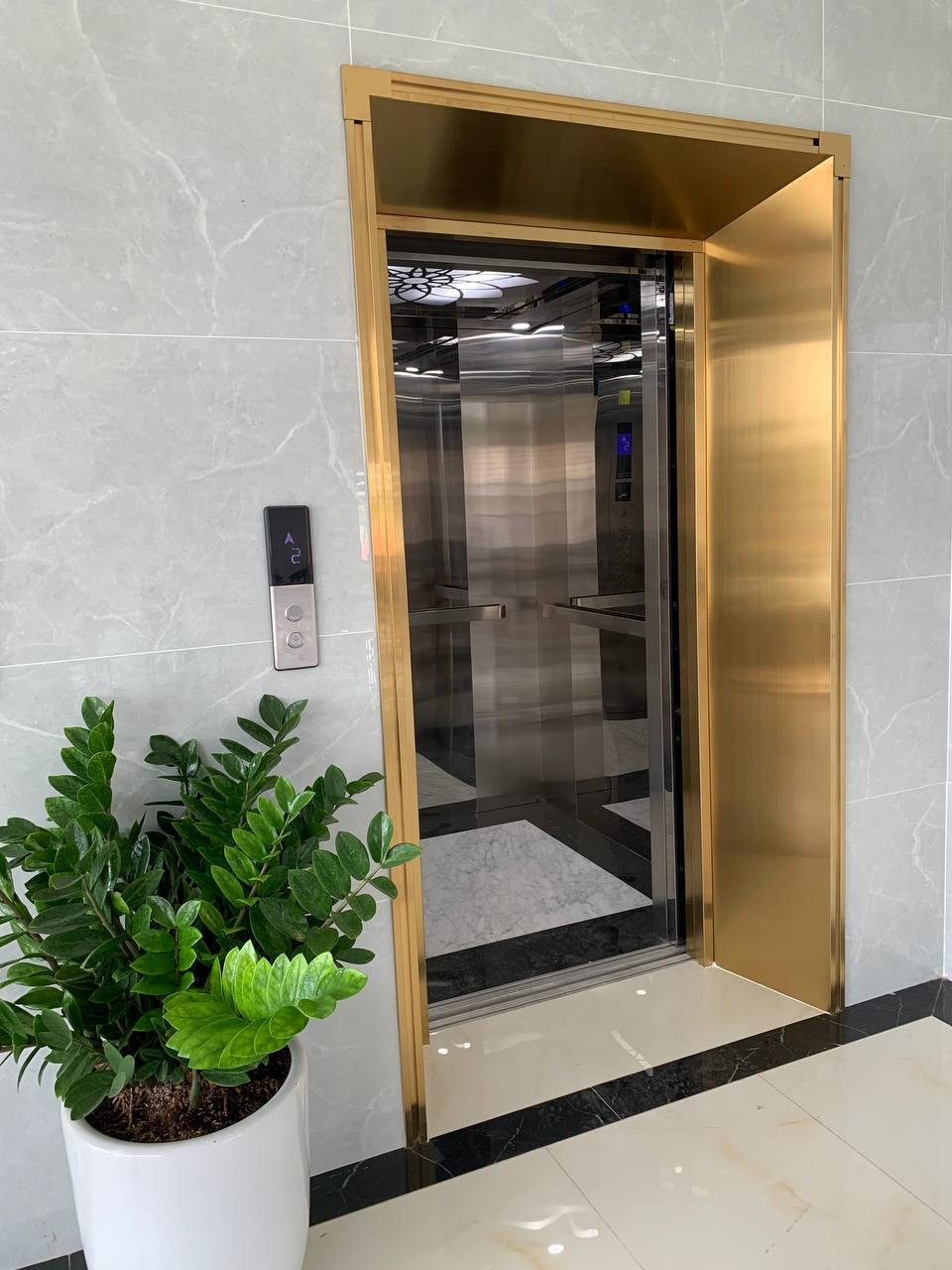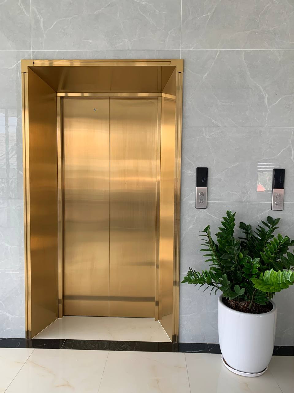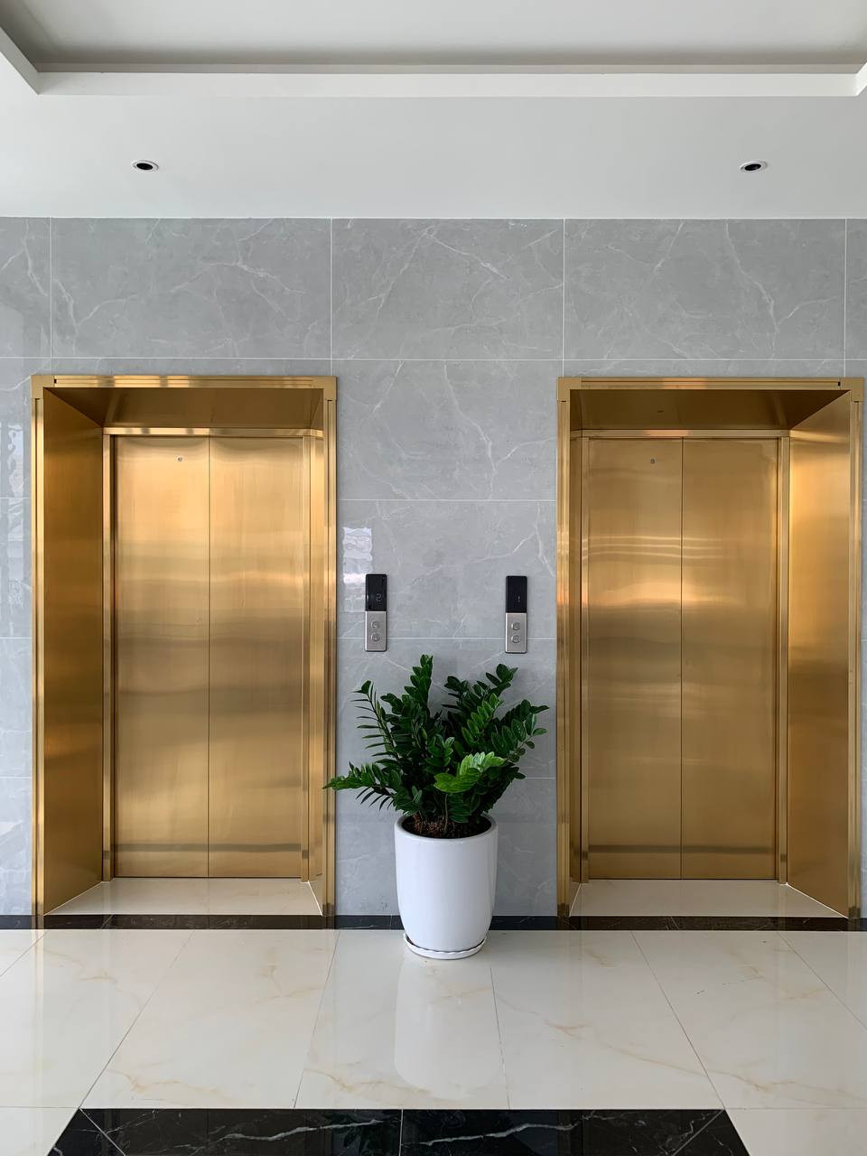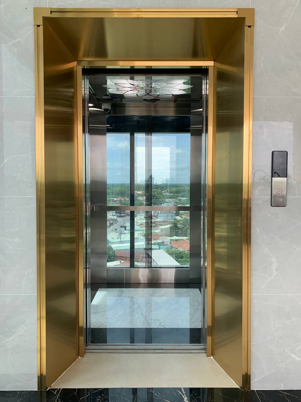 Hai thang với một thang có vách cabin bằng kính nhìn được khung cảnh bên ngoài toà nhà tạo cảm giác thoáng và sáng khi di chuyển, và một thang mẫu tiêu chuẩn vách inox gương. Điều nổi bật là sử dụng khuôn bao rộng với cửa tầng full inox vàng.
