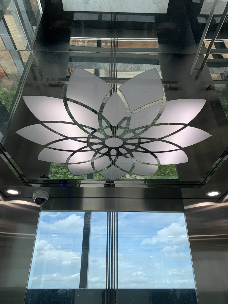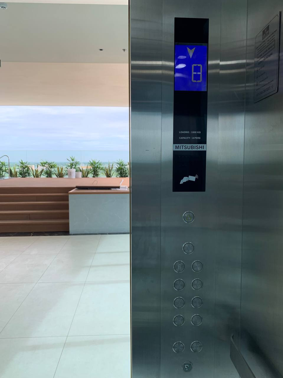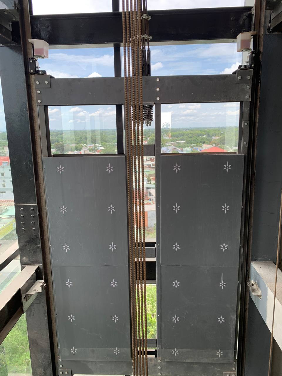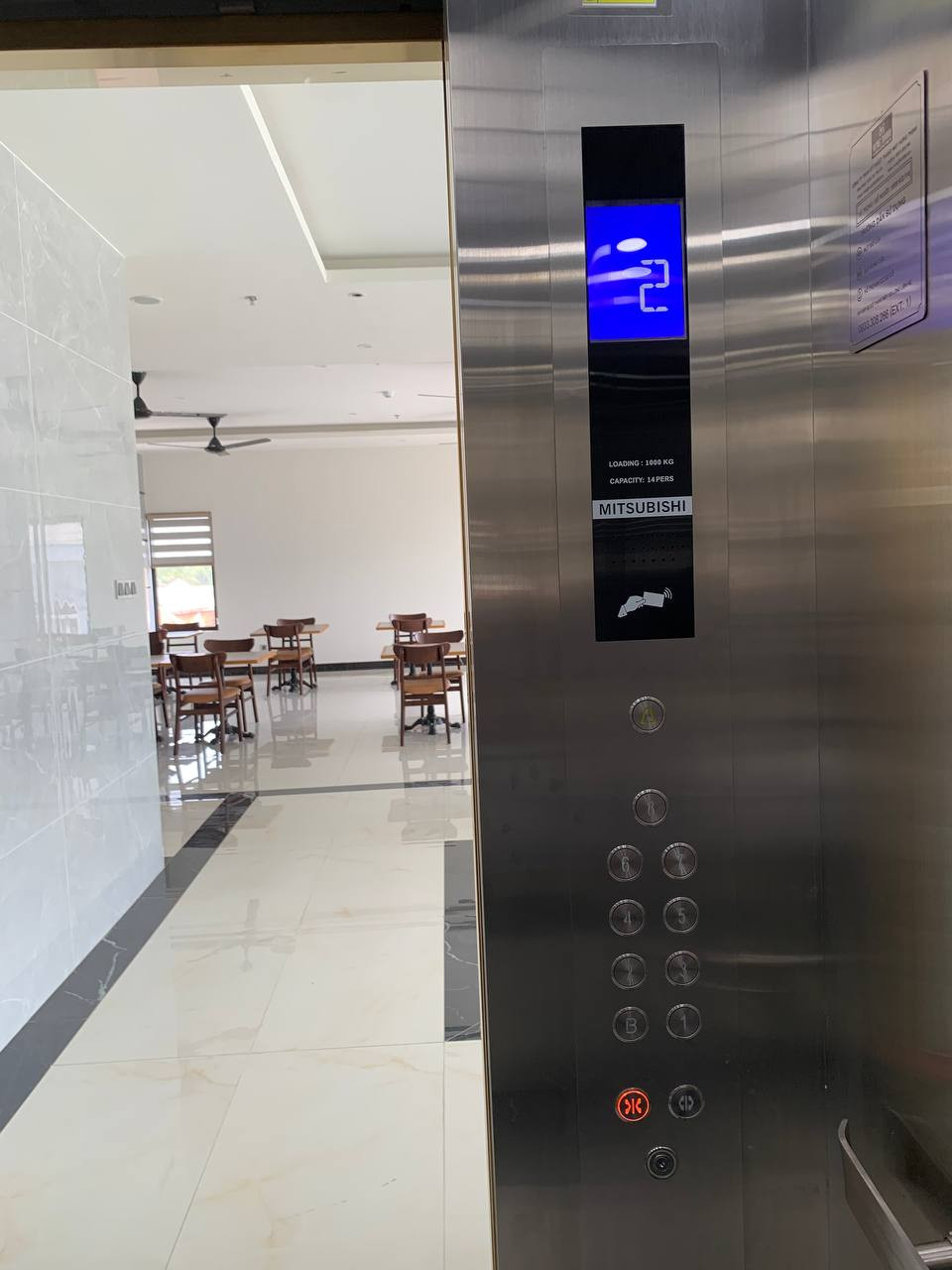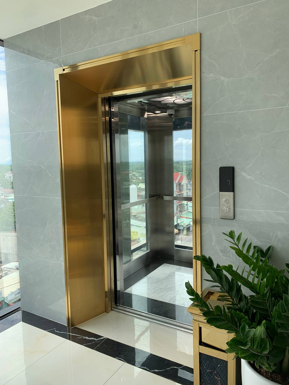 Hai thang với một thang có vách cabin bằng kính nhìn được khung cảnh bên ngoài toà nhà tạo cảm giác thoáng và sáng khi di chuyển, và một thang mẫu tiêu chuẩn vách inox gương. Điều nổi bật là sử dụng khuôn bao rộng với cửa tầng full inox vàng.