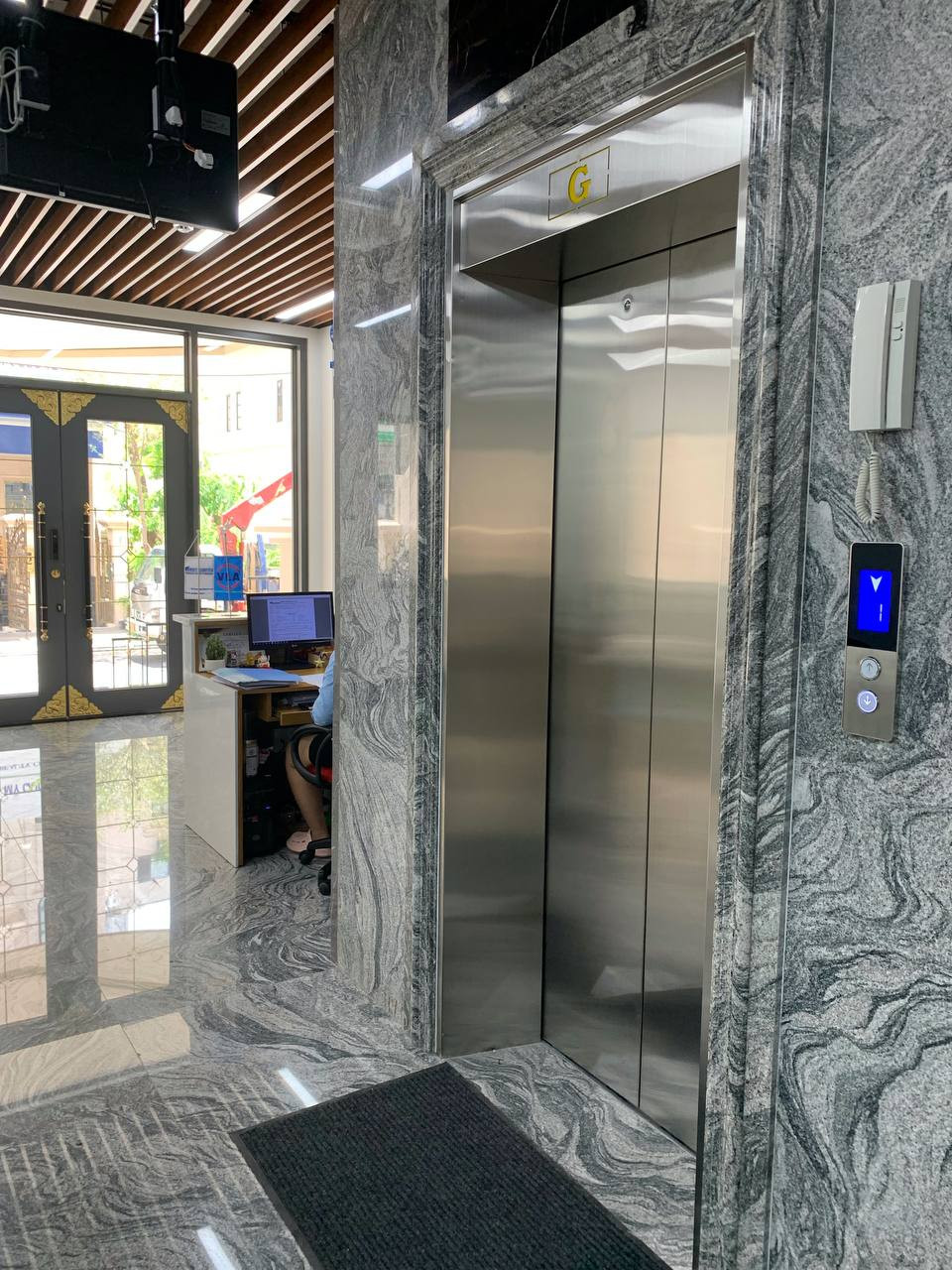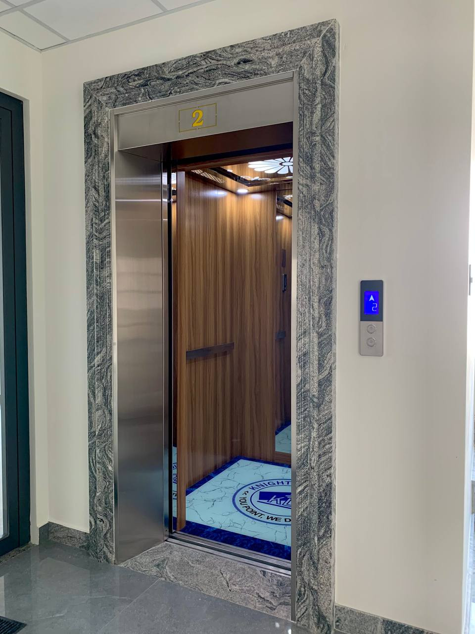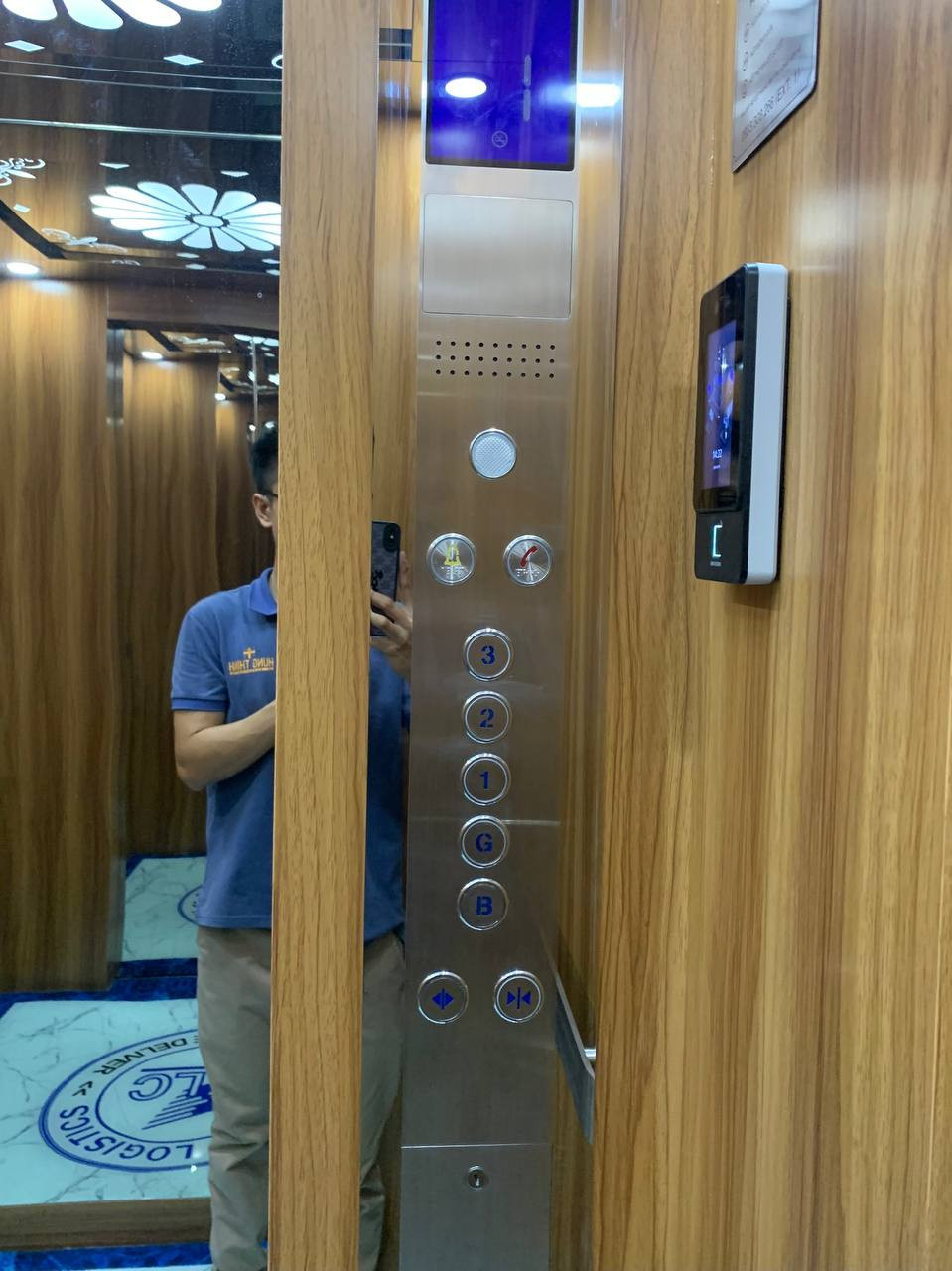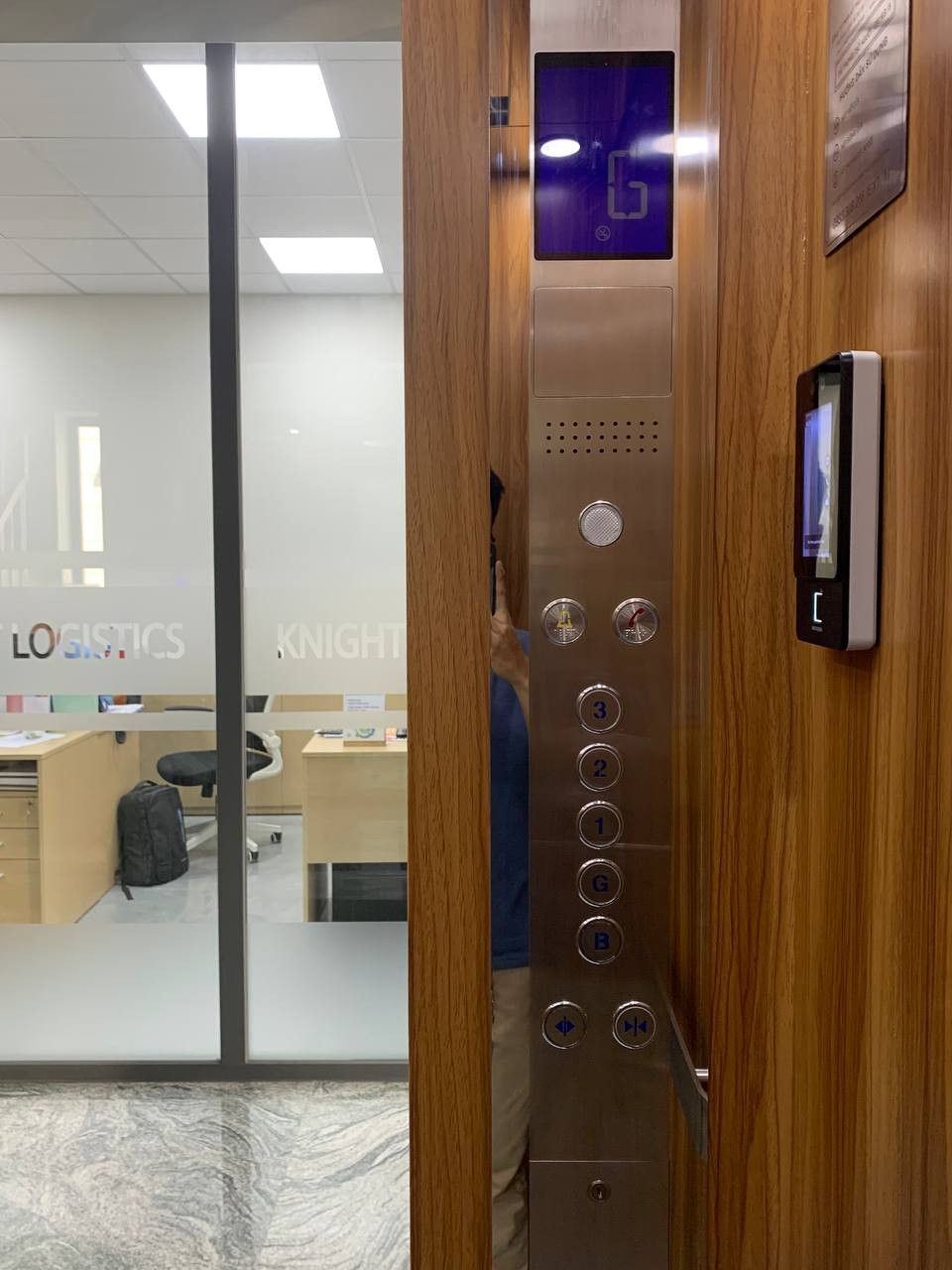 Nay giới thiệu với mọi người một sản phẩm thang máy mới hoàn thành và bàn giao tại công ty Knight Logistics địa điểm Cityland. Do là văn phòng công ty nên sàn cabin bằng kính in logo công ty sang trọng và đẳng cấp, đồng thời được trang bị thêm bộ nhận diện khuôn mặt kèm vân tay phân tầng an toàn và hiện đại.