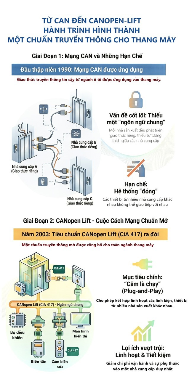 Sự phát triển của thang máy hiện đại không chỉ nằm ở tốc độ hay tải trọng, mà gắn liền với quá trình chuẩn hóa công nghệ điều khiển và truyền thông. Từ mạng CAN ban đầu đến tiêu chuẩn CANopen Lift (CiA 417), ngành thang máy đã từng bước hình thành một “ngôn ngữ chung”, đáp ứng những đòi hỏi khắt khe nhất về an toàn và khả năng tương thích đa nhà cung cấp.