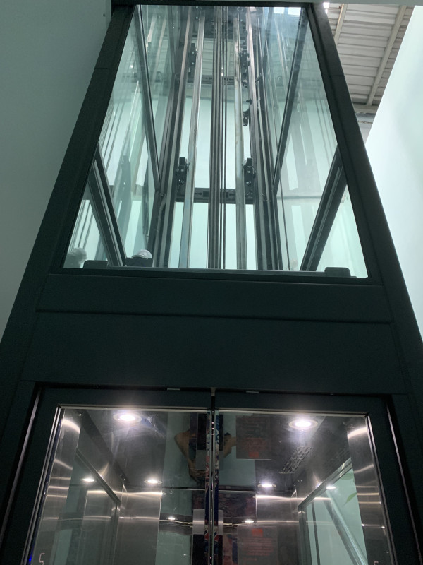 - Khung Thép Tinh Gọn: Khung thang sử dụng thép hộp màu Xám Xifa hiện đại, kết hợp với kính cường lực trong suốt, tạo cảm giác không gian mở, không hề bị bí bách dù kích thước nhỏ. Thang phục vụ 4 tầng hiệu quả.