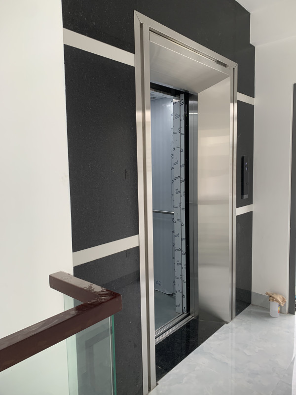Công trình nhà anh Trung là một ví dụ điển hình cho việc lắp đặt thang máy trong công trình đã hoàn thiện toàn bộ, bao gồm cả phần mặt tiền. Với đặc điểm khung bao rộng và các khoảng hở xung quanh cửa thang không đều nhau, đội ngũ thi công đã lựa chọn giải pháp sử dụng nẹp V để che phủ các khe hở, đảm bảo tính thẩm mỹ và tạo cảm giác liền khối cho toàn bộ hệ khung cửa. Đây là phương án xử lý tinh tế, giúp khung bao trông gọn gàng, sạch sẽ dù được thi công sau.