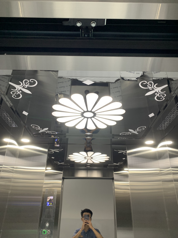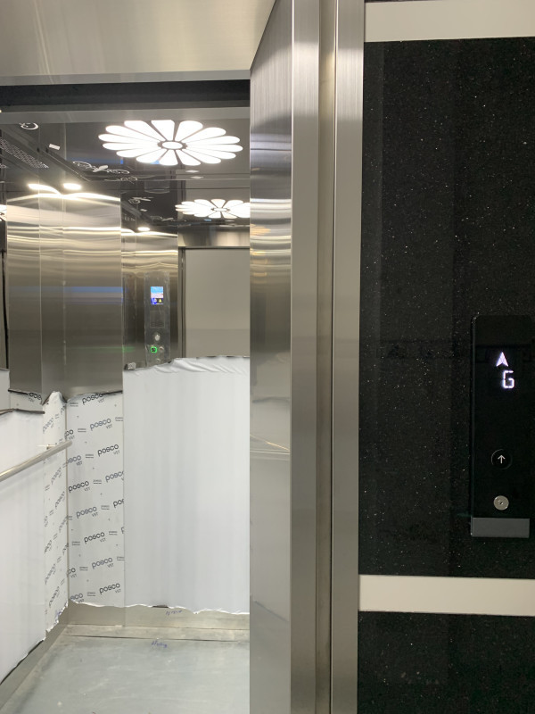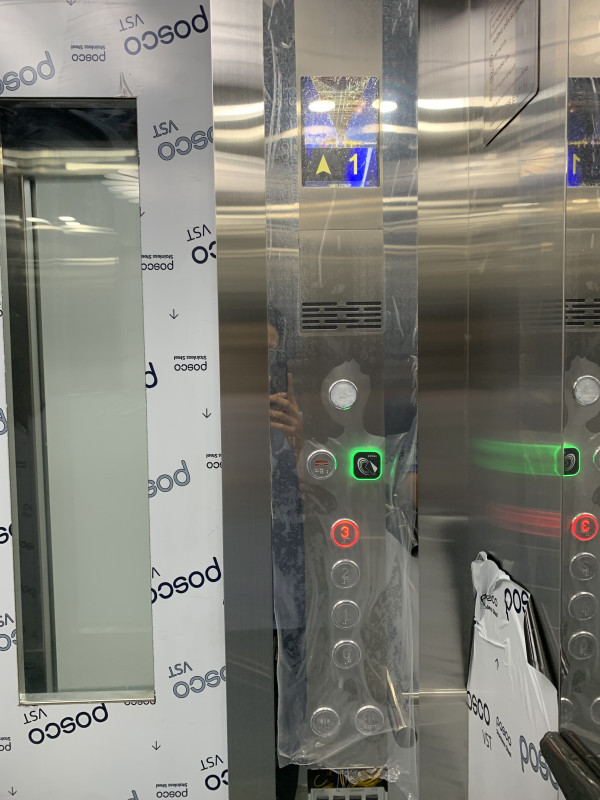 Một điểm đặc biệt khác của công trình này là sử dụng cửa tầng kính – tuy nhiên, kính được thiết kế nhỏ gọn, vừa đủ để quan sát cabin bên trong. Thiết kế này không chỉ tăng thêm tính thẩm mỹ mà còn phục vụ mục đích an toàn: trong trường hợp thang máy gặp lỗi, người sử dụng có thể dễ dàng quan sát vị trí cabin, hỗ trợ hiệu quả cho công tác mở cửa cứu hộ khi cần thiết.